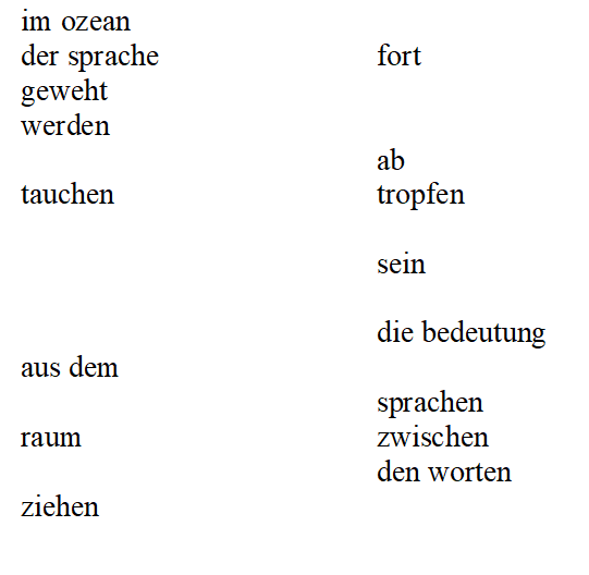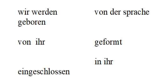 Muss man nun tatsächlich über das schweigen, wovon man nicht sprechen kann und worüber sprechen wir, um Wesentliches zu verschweigen? Alles, was und bleibt, ist ein Überbrücken der Abgründe, ein sich Brüsten: brüstungslos; wir wollen an andere Grenzen anknüpfen, Halt suchen an fremden Rändern, unsere Enden, zur Namensgebung in andere legen, im Benennen einfrieden. ich möchte:
