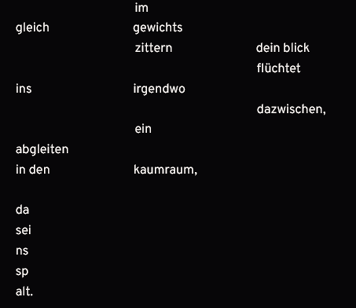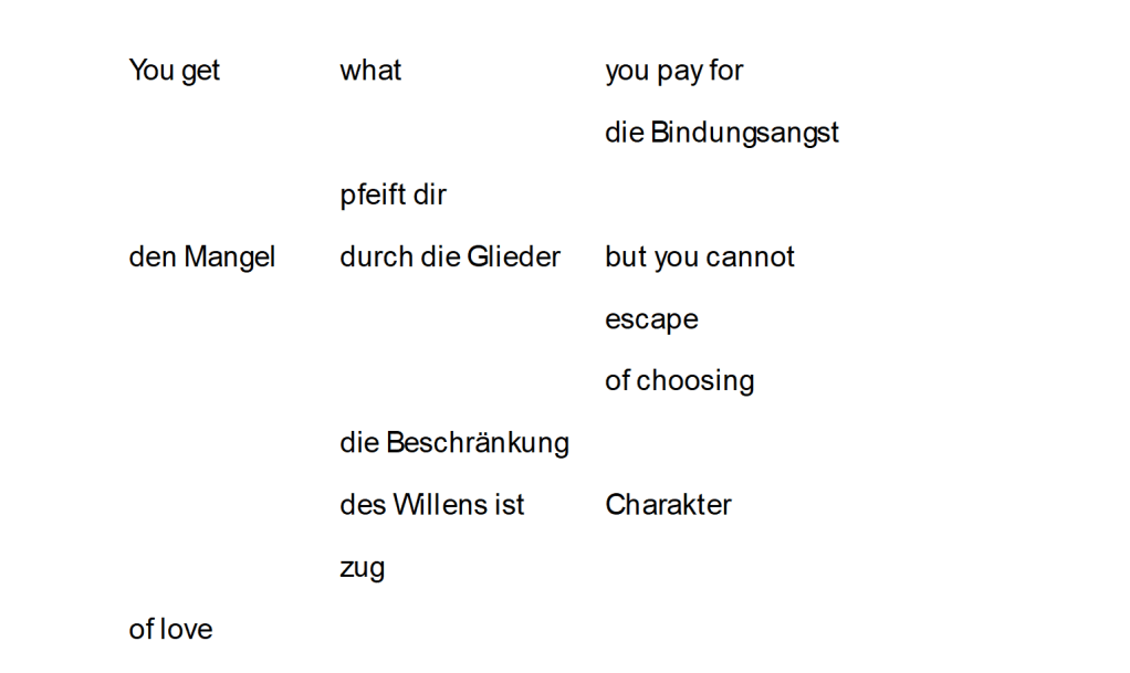 Die Schiebetür meines Kastens kann meine Erwartungshaltung nicht mehr tragen, manches springt aus, manche auf die Schienen, some people have a greater capacity than others to define the conditions under which they want to be loved und alles, was du möchtest ist, von der Erschöpfung zur Ent- schöpfung zu gelangen. (Die Dinge fallen nicht, weil sie zu schwer sind, sondern weil sie gehalten werden wollen.)